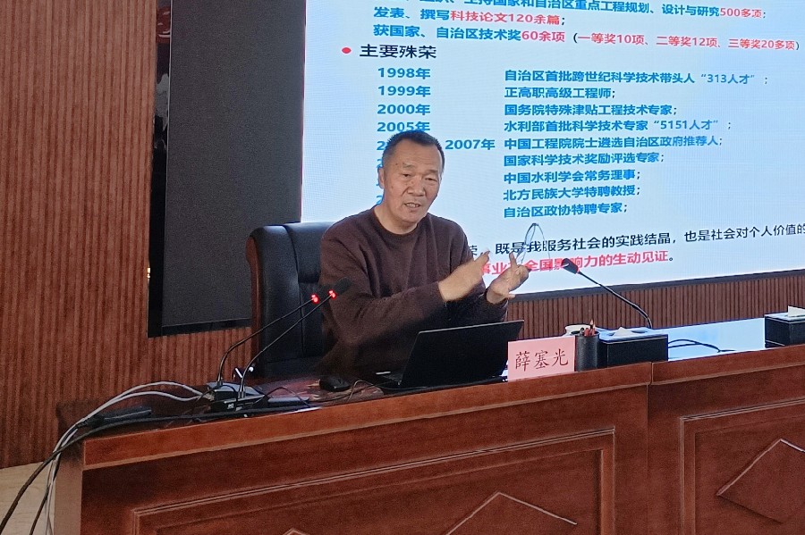 薛塞光拥有40余年水利工程实践经验,主持参与宁夏多项重大水利水电工程规划、设计与建设,获国家及自治区技术奖60余项,是国务院特殊津贴专家、水利部“5151人才”。会上,他从个人经历与业绩出发,详解工作能力形成的八大核心维度,并结合宁夏区情,介绍黄河流域水资源分布、三大区域水利特点及“十五五”水利规划方向。