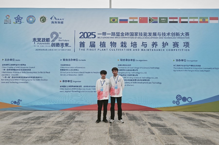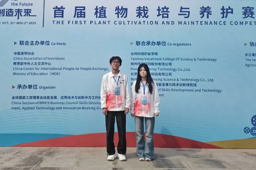 10月31至11月2日,2025第九届一带一路暨金砖国家技能发展与技术创新大赛——首届植物栽培与养护赛项在台州科技职业学院成功举办。由我院高学花、何瑞玒教师指导的左程瀚、金裕琳荣获高职组三等奖,赵鹏、杨俊福荣获中职组三等奖。这一成绩充分彰显了我院在服务绿色产业高质量发展、助力生态文明建设中的人才培养成效。