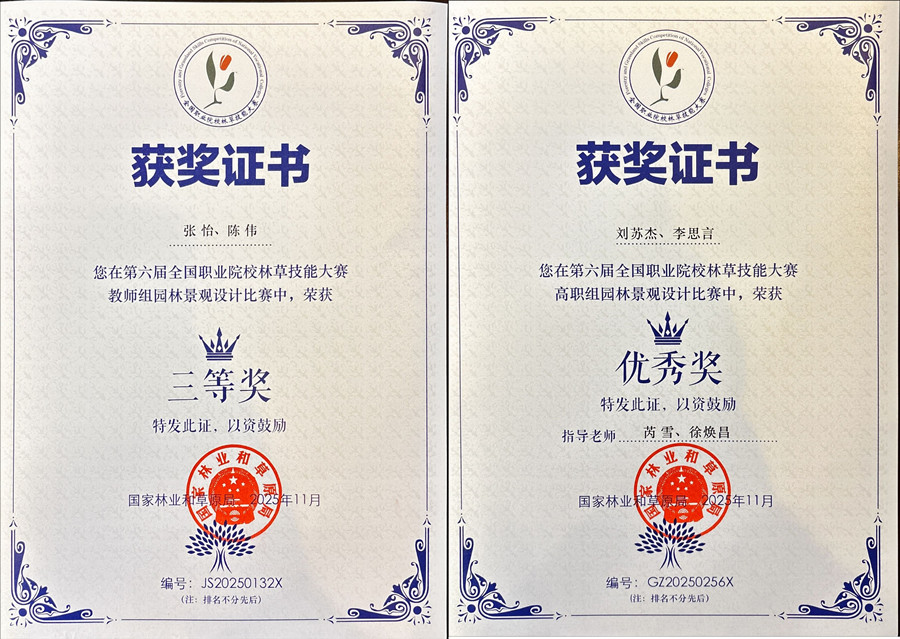 11月1日至4日,第六届全国职业院校林草技能大赛园林景观设计赛项在江苏农林职业技术学院举行。我院风景园林系张怡、陈伟老师荣获教师组三等奖;芮雪、徐焕昌老师指导的刘苏杰、李思言同学荣获高职组优秀奖。