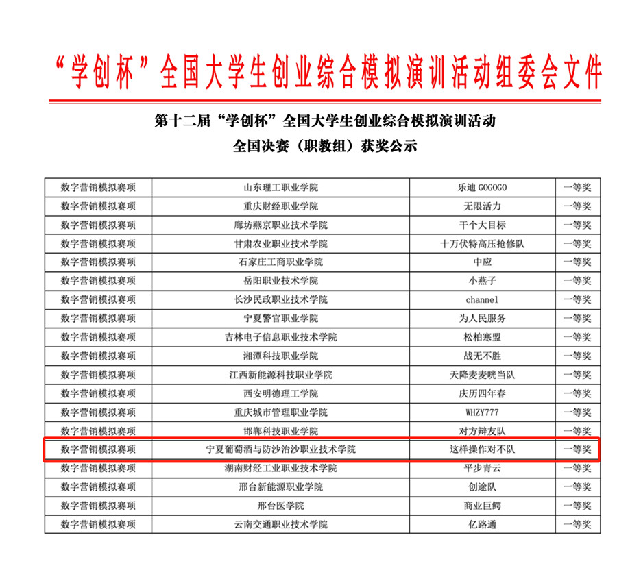 近日,第十二届“学创杯”全国大学生创业综合模拟演训活动全国决赛(职教组)在山东威海圆满落幕。我院学子凭借过硬实力斩获数字模拟营销赛项全国一等奖!这是学院在全国性创业类赛事中首次荣膺最高奖项,实现了学院在该领域的历史性突破!