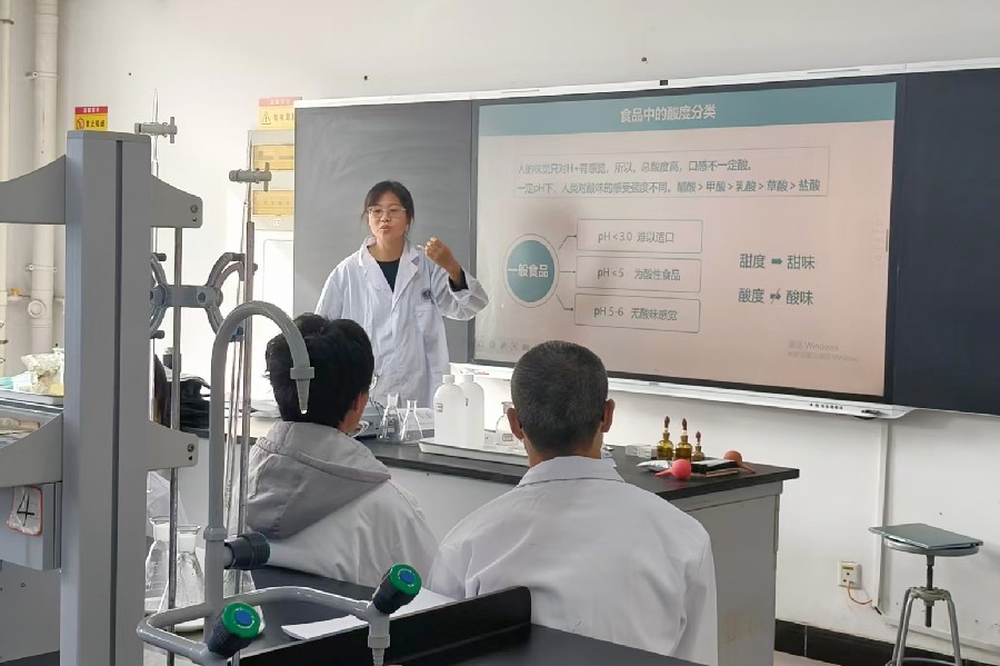 尚冀宁老师在《食品理化检验技术》实验课上,以“牛乳总酸度测定”典型检测项目为教学载体,通过规范的教师演示与系统的学生实操相结合,引导学生掌握滴定分析方法与质量控制要点,充分践行了“教、学、做”一体化的教学理念。
