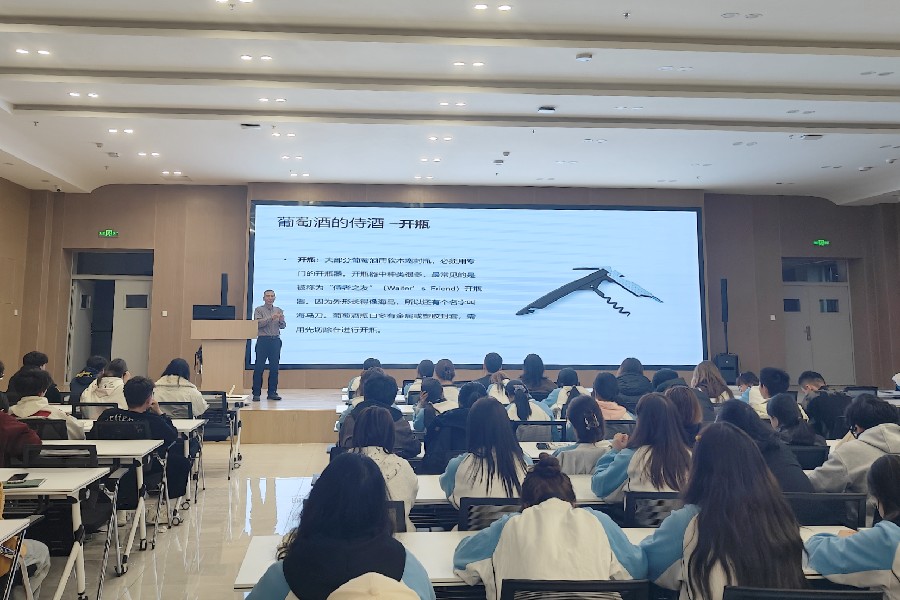 第二场讲座《探索葡萄酒的酿造艺术》则更具深度,现场座无虚席,方亮先生聚焦葡萄酒生产的核心环节,深入剖析了从葡萄采摘、破碎、发酵到陈酿的完整工艺流程。他结合自身丰富的生产实践经验,重点讲解各环节的关键控制点与技术精髓,并通过生动的案例进行展示,将复杂的酿造理论转化为直观、易懂的生产艺术,令同学们受益匪浅。